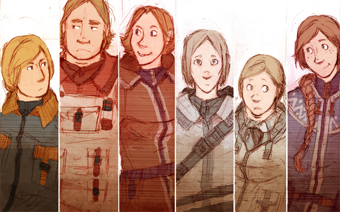 Blaargh, I'm slowly getting to a point where I just want to be done with this comic and finally get to start on...that comic that apparently doesn't even have a proper name yet. Which very clearly makes the point that I still have a ton off stuff to work out before I can start drawing a single page. I haven't even arrived at a final design for my main character's outfits. Oh yeah, for those who missed it yesterday, there's a new art log entry on the subject of the comic. And this little sketch here is actually the first time I've even drawn all of the characters on the same piece of paper: