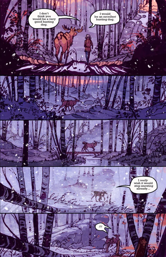 This was a fun page, drawing trees is a pretty mindless practice so I didn't have to burn too many brain cells during it. On the other hand it did take about an hour longer to finish than the average page. Drawing a panel with the whole background done ink is waaay slower than just throwing in something digitally, or even a character lineart + digital background combo. But it was worth it, I like how this page turned out, especially the top panel.