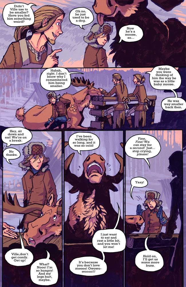 Looks like those two are always on a break. Worst employees of the month-warning? Hannu isn't that great either, he may not take quite as many breaks, but he makes up for that by a tendency of losing focus on what he's supposed to be doing, which often results in the burning of things that should not burn. And yes, Hannu is a baker. Isn't that just the absolutely most prestigeous and fitting occupation for the hero of a comic? It isn't? I do think it is.