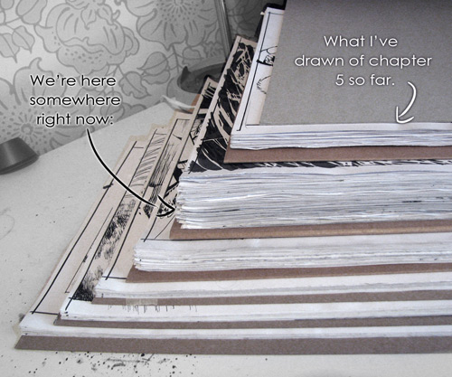 Chapter 4 is almost as long as chapters 1,2 3 and the prologue combined, I think it's like seven pages short of that. Aw man, I should have stretched it out for a few more pages! Ah, and chapter 5 seems to be coming along quite nicely too. See how I remembered to cover up the newest page with a piece of cardboard to keep spoilers from happening? Smartness! *points at brain*