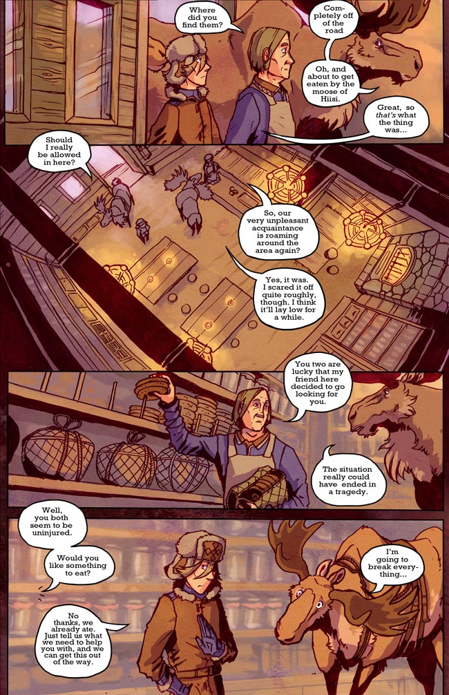 There's some wonky perspective stuff going on in the main panel, but overall I'm happy with it. I skipped using a ruler on purpose to add some looseness and life to the room, so I'm at peace with the crooked, rough lines. But there's also whole lot of actual issues going on here and there, not aggressively obvious stuff, but there's enough of it to kind of create an uneven feel to the place. It's pretty clear that I didn't manage to keep the vanishing point stable through the scene when I sketched the place up, it wandered around a bit. My worst mistake has, however, a very conveniently placed speech bubble on top of it. Completely by coincidence, I did soooo not try to cover it up or anything! o_o' (Believe me, please? No? Okay. Good, you shouldn't.) See the area around the upper part of the panel where the shelves are meeting at a corner with the cashiers table? There's some seriously confusing linework hidden there, do not approach that area! It will suck you right into the terrifying world of Escher.