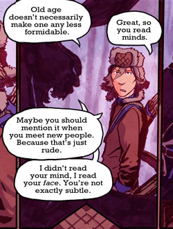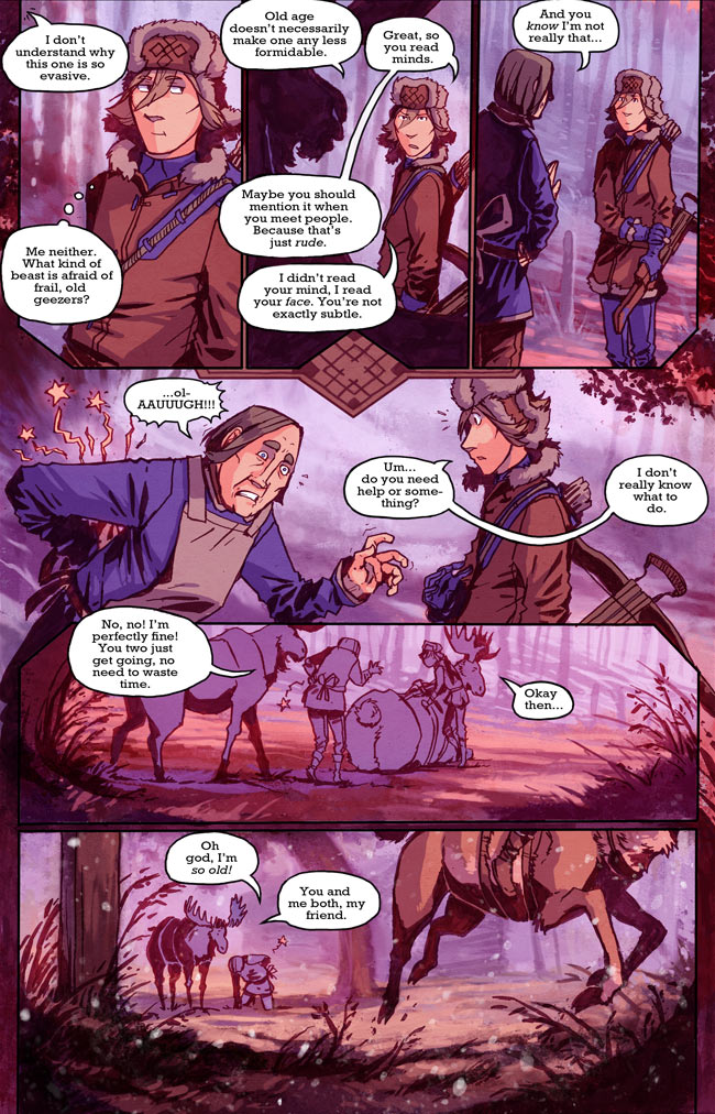 Just look at that! I couldn't even make sense of the reading order of those things myself when I went to do my final typo-catching and file-resizing round yesterday. First of all, since the tail of Mr. Moose's second speech bubble runs through Hannu's own, at a quick glance those two were very much in danger of getting mixed up. Especially since the tip of Mr.Moose's speech bubble tail starts off earlier than Hannu's, giving the prompt that his part of the dialogue should be read first. On top of that my eyes didn't really know where to go after the first speech bubble: to the right or straight down? The distances between those speech bubbles is different, but for some reason I kept jumping right down to the bottom of the panel. So,major revamping anoy, and now those issues are hopefully solved. Running the connector-tail of Hannu's two speech bubbles straight through the panel isn't an ideal solution, but it's the best I could come up with here. :B