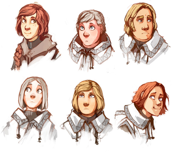 Nnngh, I'm getting pretty nervous about this impending move (S-Sunday!). My room is finally all packed up and there's not too much left to do on that front, just a few last minute things here and there such as wrapping my computer in bubble wrap and trying to fit everything in my mom's little car. But I feel like the nervousness is attempting to render me lethargic, so I'm trying to keep as busy as I can by working on last-minute SSSS stuff before I start drawing the actual pages. Here's some quick main character portraits I painted yesterday:
