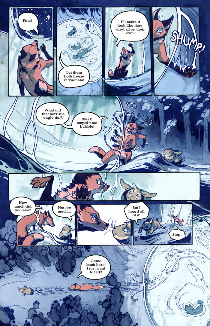 Oh, Kokko, thwarting Puppy-Foxe's evil little plans once again. I was surprised/kind of happy to see that so many of you already figured out that Kokko cast her own stasis spell on the previous page, well noticed guys. But nooo, it's Saturday! Now we won't find out if Puppy-Fox eats little Brat-Bunny until Monday, awww. Also, next week...you'll get to finally see Ville in his last form! Not yet on Monday, but definitely next week, yup. And I've finished page 18 of SSSS, so here's a preview panel: