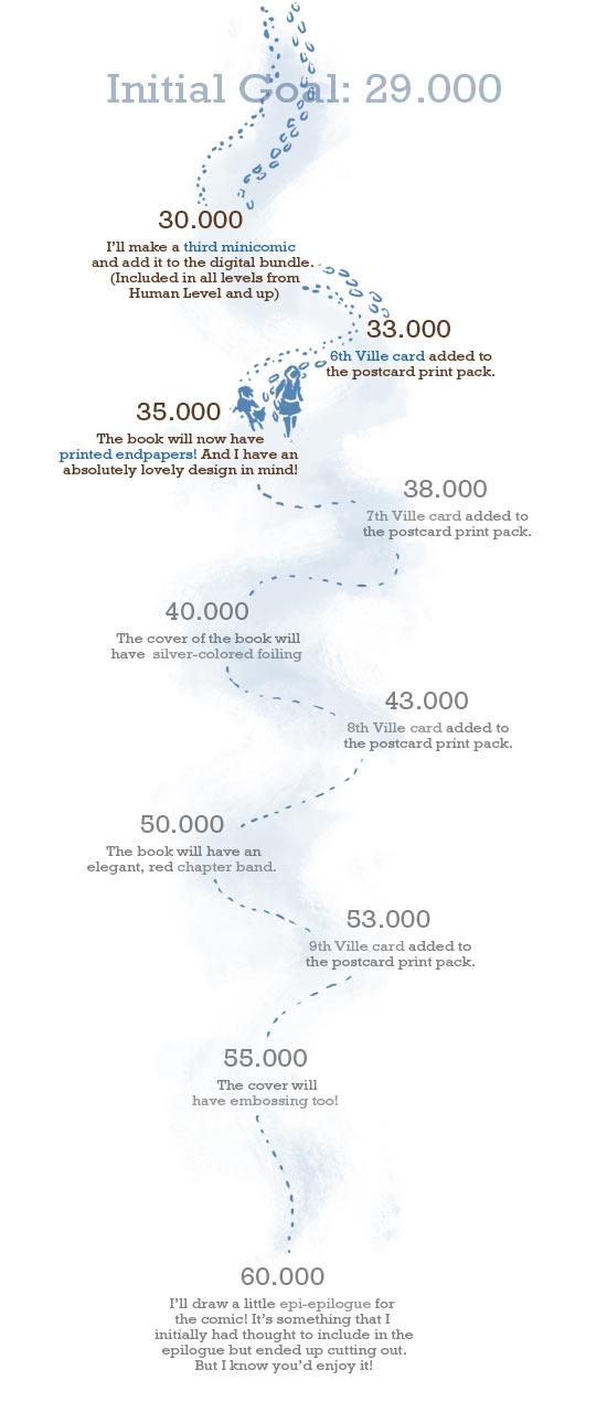 As you can see we've already knocked down the first three ones since I first posted this chart, so now I'll also make that third minicomic, the postcard print pack will now include six different Ville-cards instead of five and the book will have printed endpapers instead of just blank or single-color ones. Also, here's two more commonly asked questions with their answers (I'm adding all the questions to the bottom of the campaign page too):