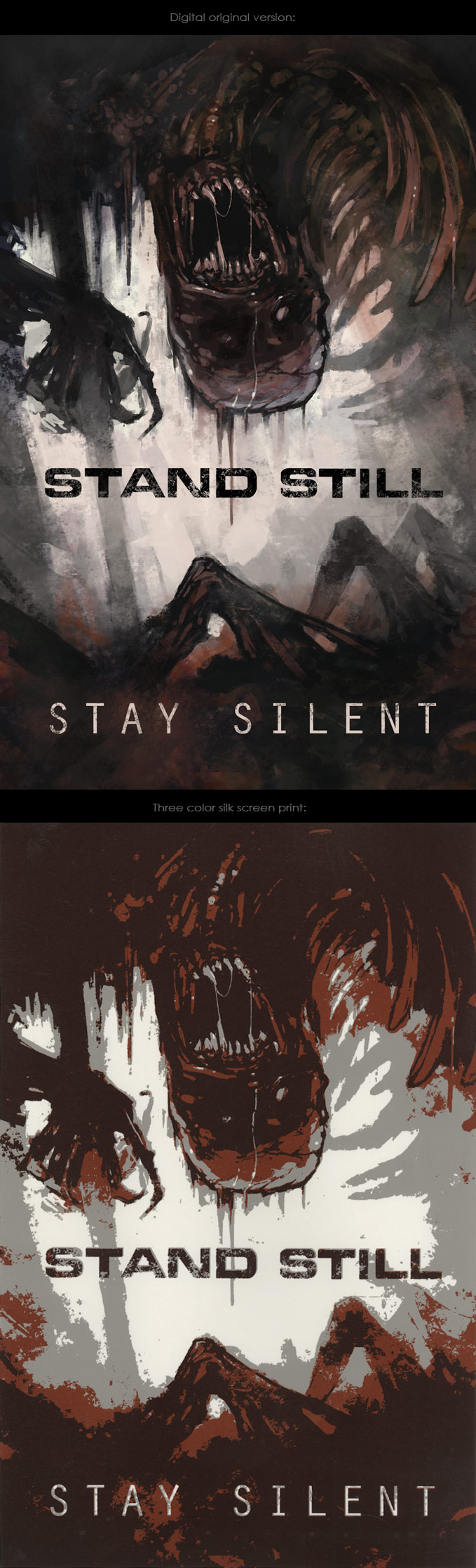 SSSS concept art, silk screen print done in school. I'm trying to figure out what kind of typographic style I should aim for in this comic, but I'm having a really hard time making any kind of decision other than "got to have some cracks, grunge and stuff in there." -_-