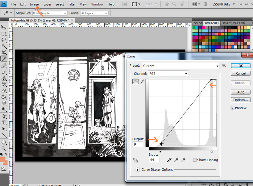 The first thing I do with every scanned piece of lineart is to make sure the white areas are white rather than light grey and make the dark areas a bit darker if needed. This I do in the curves window (nr.1 in the image below) by dragging the top part of the curve to the left to turn the light grey parts into white. The bottom end of the curve controls the dark values, and dragging it around adjusts their intensity. As you can see in the video, I also even out the brush strokes in the large, black areas by carefully painting some gey over them with a very rough and highly transparent brush.