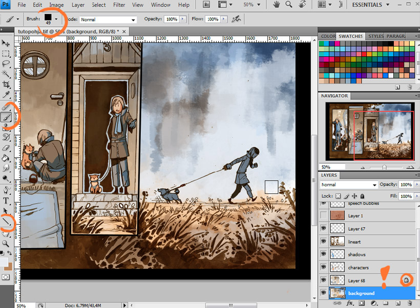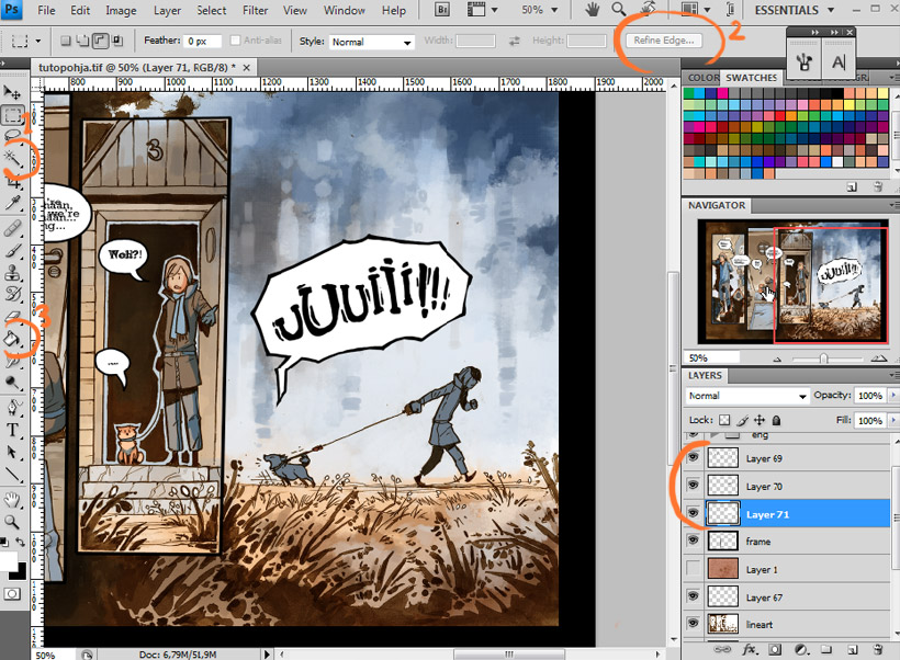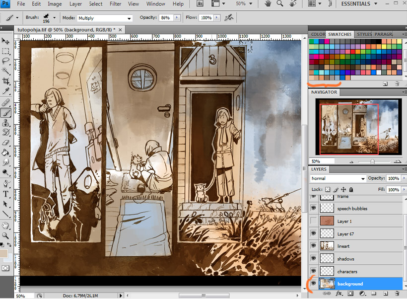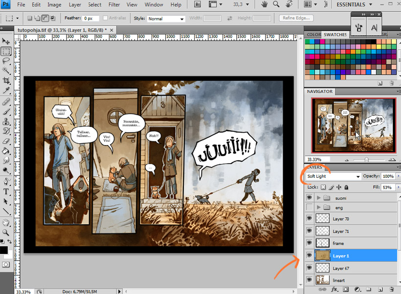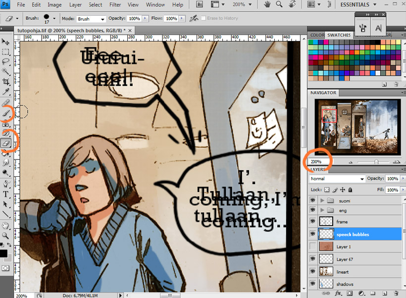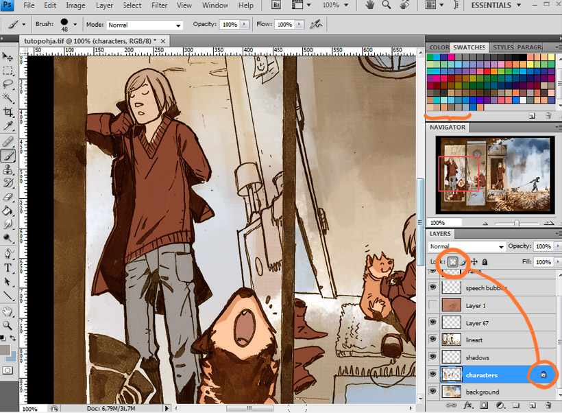 After the flat colors are done, I lock the layer (using the top icon that looks like a little square in the layers tab) and start manually drawing in the correct colors for each area. I've got the main colors (faces, Hannu's hair, clothes, Ville's fur) added to my swatches to make sure they're easily accessible and always consistent through a chapter. By the way, I noticed by watching the recording that I have a strange habit of first opening the color window and then choosing the color fom the swatches with the color sampler tool. That is dumb, don't do that! You can just click on the color swatch right away and it'll be selected. It's probably a habit left over from the years of digital painting when I never used swatches and just picked custom color through the color window.