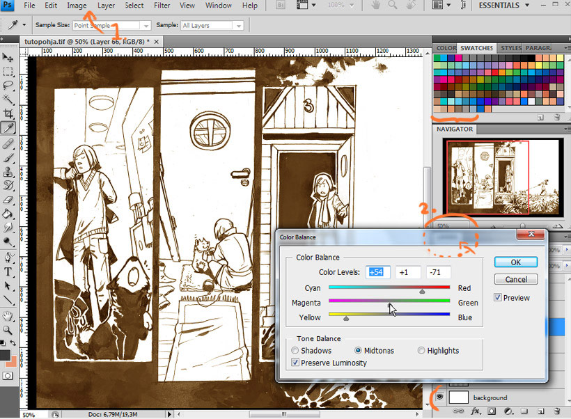 Then the colors. I go to "color balance" (nr. 3 in the previous image) and mess around with sliders. The colors won't be particularly noticeable in the end, since after setting the lineart layer to "multiply" the color values will be added to the colors below it and turn quite dark, except right on top of light colors. But it will bring some subtle flair to the image. By the way, the layer setting is changed into "multiply" in the little dropdown box (labeled 2. in the image) that's annoyingly covered by the color balance window in this shot.