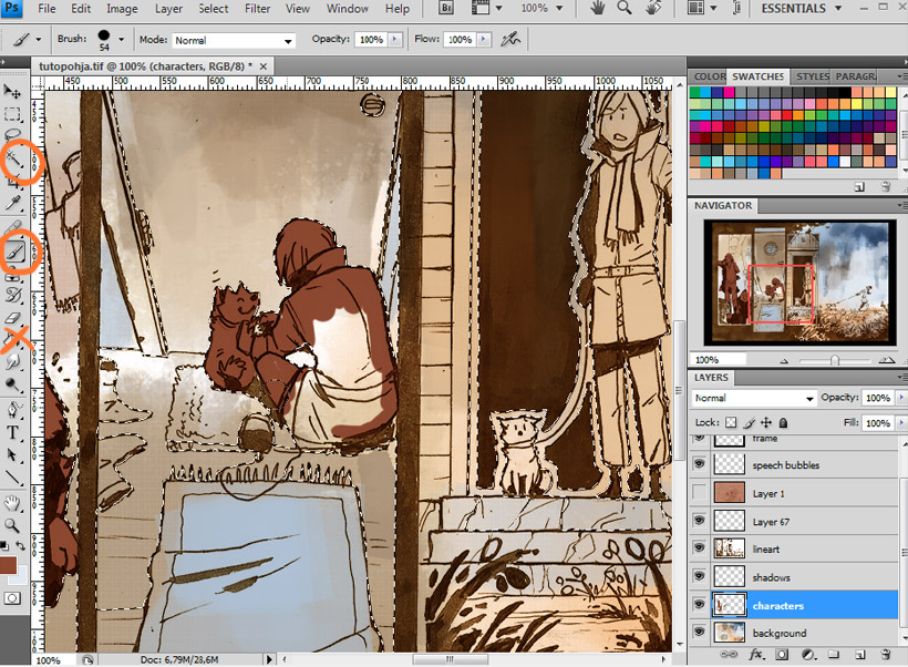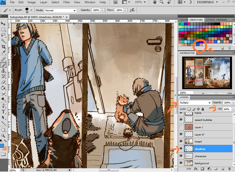 Now the shadows! Here I use the same magic wand selection tactic as before to shut out the area I don't want to accidentally draw shadows on, except this time I can simply select the area outside the colors in the "characters" layer in one click and inverse that. This "shadows" layer is set to "multiply" to make the shadows blend with the colors beneath, and the "fill" (or "opacity", doesn't matter which) is set to whatever I feel fits with the lighting of the chapter I'm working on. These are all personal preferences though, there's of course tons of cool layer settings that could suit someone else's way of drawing shadows better. Additionally I always have two swatches for the shadow colors for each chapter: one general shadow color, and one more suitable for skin shadows. To apply the shadows I just draw them with a regular, round brush wherever I feel they should go.