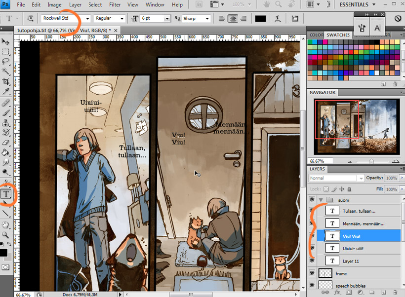 I keep the text layers inside layer groups to keep the layer tab as clean and organized as possible. Since I do the dialogue in two languages I'll occasionally end up with dozens of text layers that will make the layers tab really difficult to search through. Here's the Finnish dialogue first, with its own layer group named "suomi", the English dialogue group wil naturally be named "eng".
