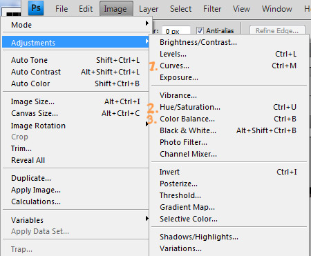 After this I'm going to change the color of my lineart a bit make it less dull, because that's what completely black linearts are. But right before adding color, I'm going to make sure the lineart is completely and evenly grey, since my inks and varying types of markers all have slightly different hues of black that will show in the scan. I don't want the final colors to be off balance, even if no-one else but be noticed it. To do that, I go to "hue/saturation" (nr.2 in the image below) and drag the saturation slider all the way to 0.