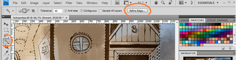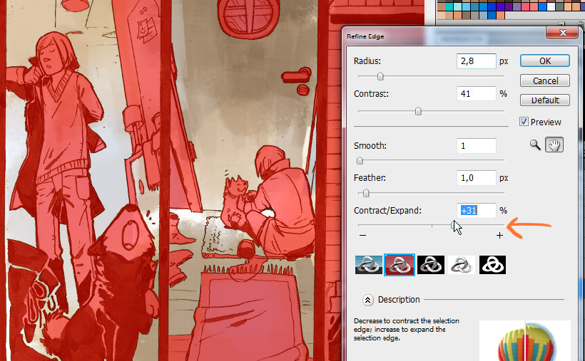 After the quick color mess for the background I start the flatting process, which means I color in the areas for the characters on its own layer. When I have a very difficult lineart with a lot of lines everywhere I just color it all free-hand with a brush, but often I also use the magic wand selection tool to help me stay within those lines. When there are large, blank and therefore easily selected areas outside my character linearts I select those with the magic wand and invert the selection from "selection"-> "invert selection". Then I won't be able to accidentally color in the area outside the character lineart! In the selection stage I also adjust the selection area a bit to push it slightly into the lineart, to make sure the colors don't bleed outside the lines. (se images below for the settings I use, tey're not exact in any way so feel free to play around with them!) By the way, in this part the fill bucket is just pointless, I just end up with tons of color in places you don't want any.