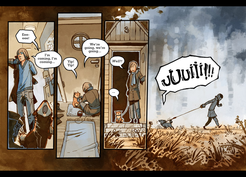 The last thing i do before the page is declared done is to turn my color/texture layer visible to push all the colors in the image into a more similar and harmonic range. The texture is a very faint watercolor mess I painted myself years ago and scanned in. Its purpose is to make the completely flat, digital-looking color areas of the caharacters slightly uneven so that they don't clash too much with the hand drawn lineart, but it's a very subtle effect, barely noticeable. The texture itself has a color that I've added the same way I add color to the lineart (see the beginning). The layer is set to "soft light" and usually has about 40%-60% fill to make it very gentle.